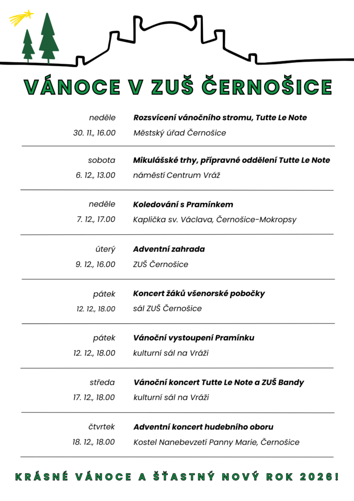 Adventní a vánoční koncerty Základní umělecké školy Černošice patří k tradičním kulturním událostem, které již řadu let zpříjemňují předvánoční čas žákům, jejich rodinám i široké veřejnosti. Program letošního prosince nabízí řadu vystoupení na různých místech našeho města.